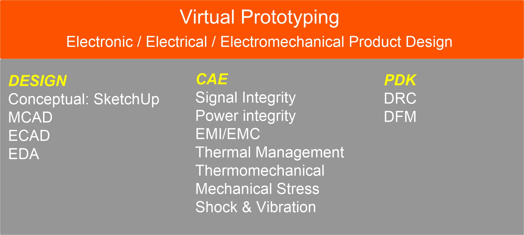 Virtual prototyping is a fundamental technology in SDA’s product design ecosystem. In the context of electronics / bioelectronics product design, it encompasses a set of technological approaches addressing design, its validation using simulation and finally the assessment of manufacturability, all without building physical prototypes. Computer-aided design (CAD) which is further delineated into mechanical (MCAD), electrical (ECAD) and electronic (EDA) software tools is typically the starting point, followed by computer-aided engineering (CAE) software to validate a design before committing to making a physical prototype. Concurrently or subsequently, manufacturability checks are performed before commitment to volume manufacturing.